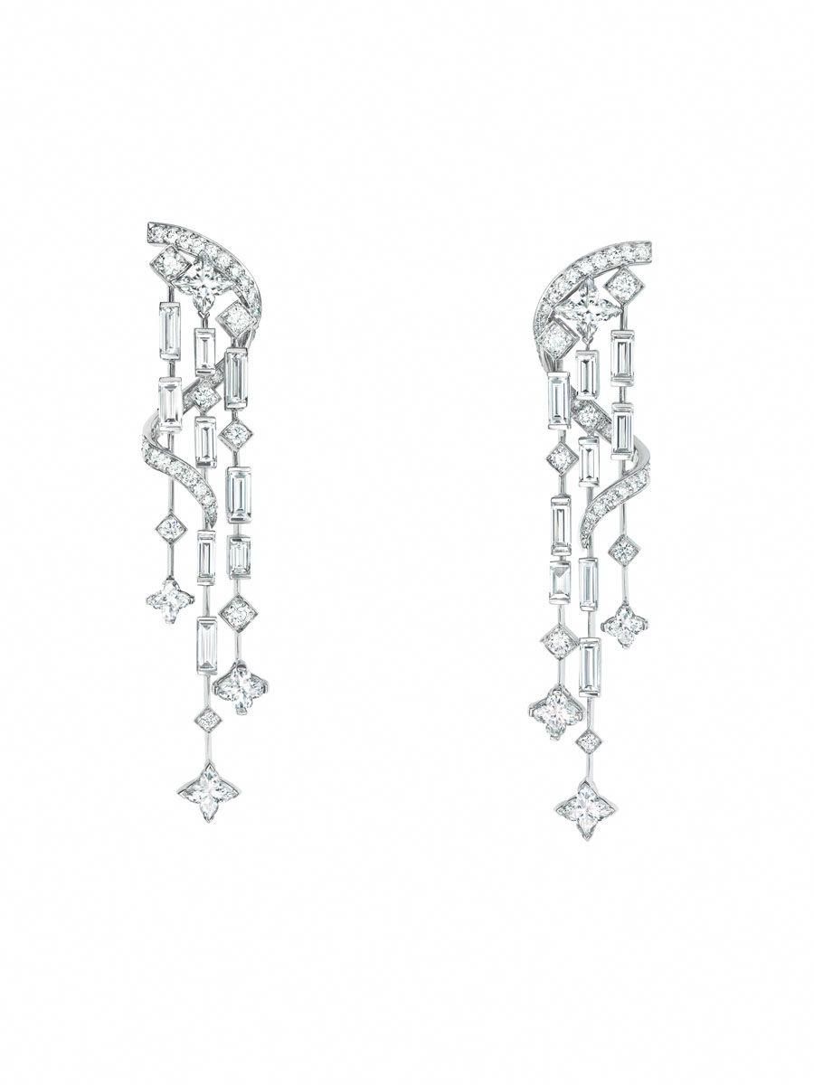 The earrings are crafted with a mix of baguette and square-cut sparkling stones, arranged in graceful